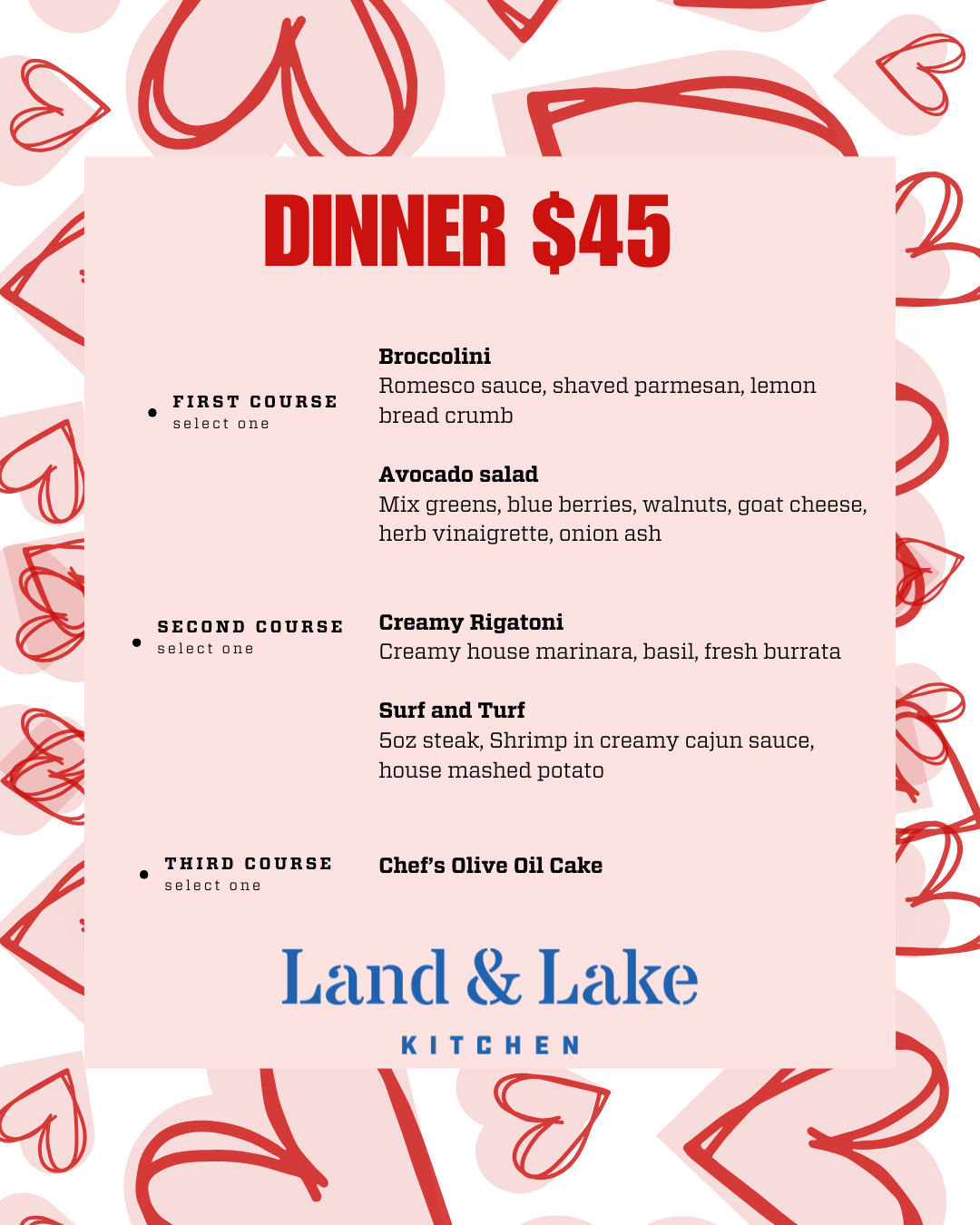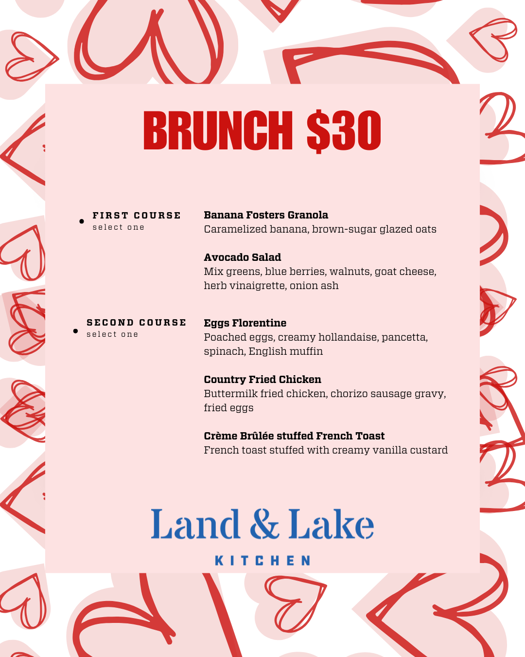 Love is in the air at Land & Lake! Join us for a special Valentine’s Weekend celebration, featuring our pre fixe menus for you and your special someone. Make your reservations now for a romantic Chicago dinner or a brunch with your favorite friends!